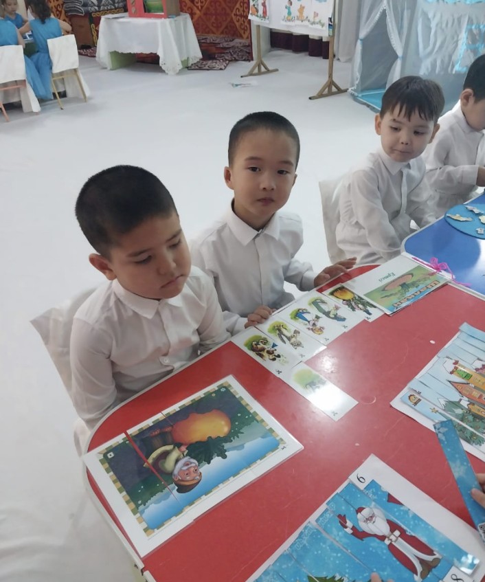 Ойын шарты:балалар ертегі желісі бойынша кейіпкерлерін рет-ретімен ұйқастырып орналастырып шығу керек.