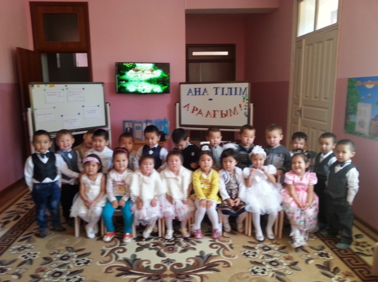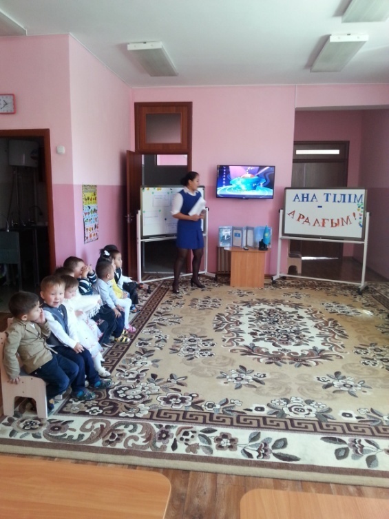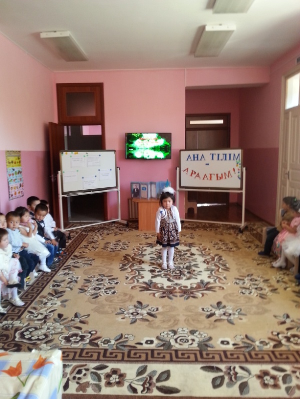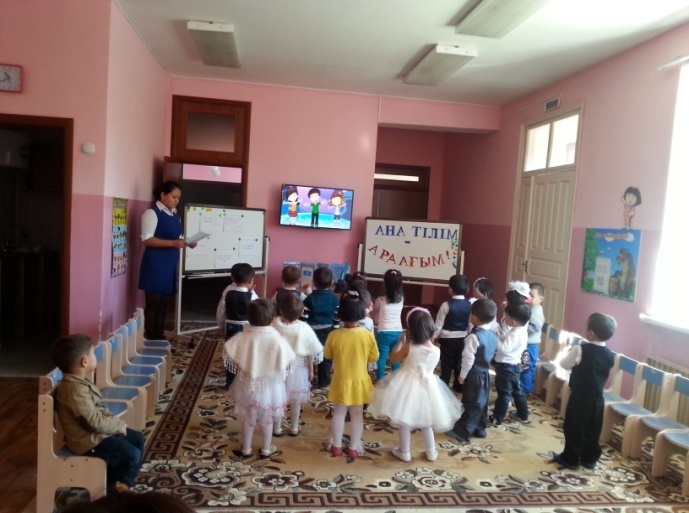 Тәрбиеші: Қайырлы күн, құрметті Ана тіліміздің меркесіне жиналған қауым. Тілмерекесіне орай өткізгелі отырған «Балдырған» тобының мерекелік тәрбие сағатын бастауға рұқсат етіңіздер.