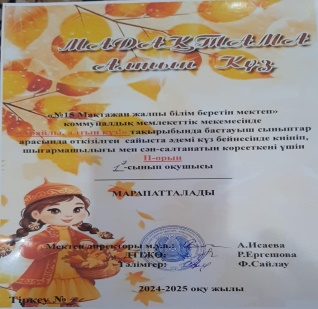 Сыныбымыз мектепішілік «Алтын күз» көрмесінде 1 орын және әдемі күз бейнесінде киінгені үшін 2 орын иеленді. Бұл да ата-аналар қолдауының арқасында жеткен жетістігіміз деп ойлаймын.