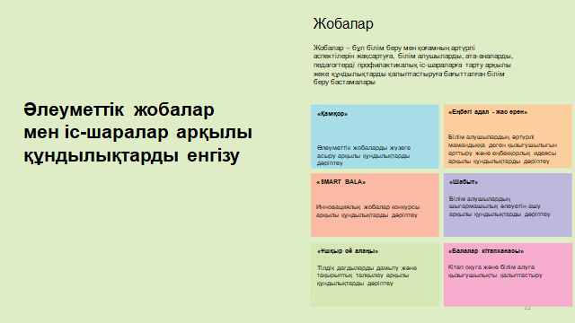 -оқушы бойындағы шығармашылық қабілеттерінің дамуына жағдай жасау; -мұғалім, оқушы, ата-ана арасындағы психологиялық қарым-қатынастың қалыпты болуын қамтамасыз ету; -ата-аналармен жұмысты жалғастыру, мектепішілік жұмыстарға тарту;
