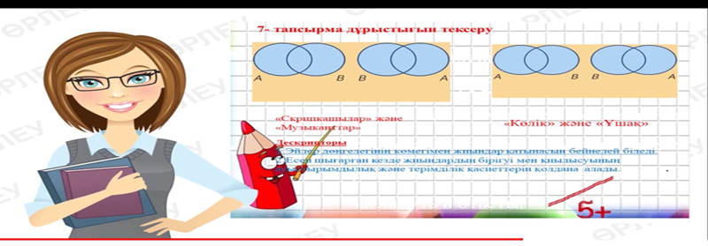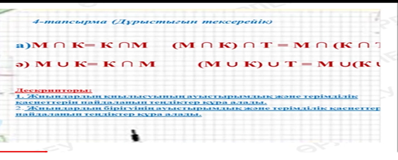 Дескриптор: Күндеікті өмірден алынған деректерден есеп құрастырды-1б Есепті түсінеді-1б Шамаларды таба алды-1б Дескриптор: Ортақ элементі бар жиындарды тапты-1б Жиындар туралы біледі-1б Дескриптор: Жиындардың қиылысуын білді-1б Тапсырманы талапқа сай орындады-1б
