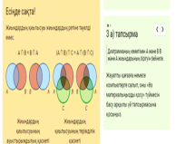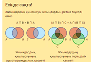 Есеп шығарған кезде жиындардың бірігуі мен қиылысуының ауыстырымдылық және терімділік қасиеттерін қолдануды үйренеді |