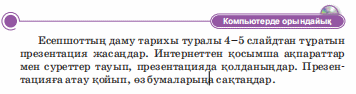 Дескриптор - Интернеттен ақпарат алып, Ада Лавлейс пен Чарльз Бэббиджтің үлесін зерттейді -Ежелгі құрылғылар ( есеп шоты, логарифм сызғышы) туралы қысқаша жазады - 1940–2020 аралығындағы компьютерлерді сипаттайды 2 балл Дескриптор: - Берілген тапсырма бойынша таңдауыңды 3 себеппен түсіндір. 2 балл Дескриптор: Есеп шоттың даму тарихы туралы 4–5 слайдтан тұратын презентация жасайды - Интернеттен қосымша ақпараттар мен суреттер тауып, презентацияда қолданады 2 балл Дескриптор Тапсырманы орындайды Дескриптор: Тақтадағы сұрақтар ойыны бойынша сұрақтарға жауап береді -2 балл |