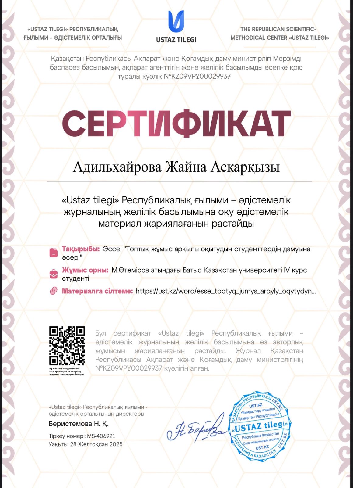 Менің өмірлік ұстанымым – білім – адам өмірін байытатын негізгі құрал, ал әрбір мұғалімнің мақсаты - шәкірттің жан-жақты дамуына үлес қосу, бұл әрбір педагог үшін ең маңызды қағида болып табылады..
