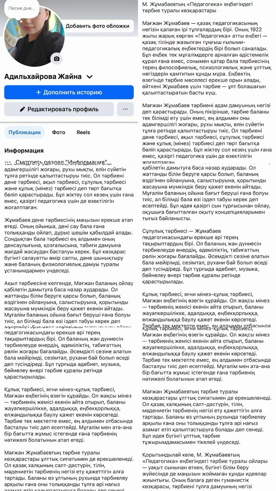 «М. Жұмабаевтың «Педагогика» еңбегіндегі тәрбие туралы көзқарастары» тақырыбына жарияланған мақала: