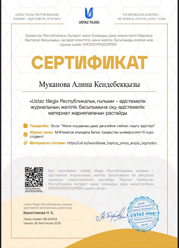 «Жеке оқушының даму деңгейіне сәйкес оқыту әдістері» тақырыбына жарияланған мақала: