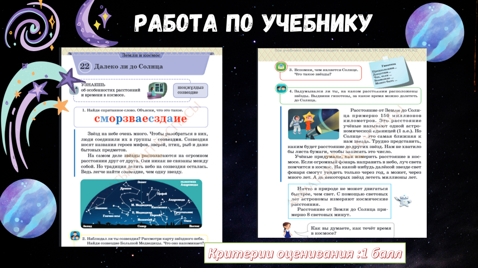 (П) Работа в парах. Задумывался ли ты, на каком расстоянии расположены звёзды. Выдвини гипотезы, за какое время можно долететь до Солнца. 2 .4.3.2 объяснять особенности расстояний и времени в космосе; 2.1.2.4 составлять план проведения наблюдения; 3. Работа по теме урока. (К) Работа в коллективе. Расстояние от Земли до Солнца примерно 150 миллионов километров. Это расстояние учёные называют одной астрономической единицей (1 а.е.). Но Солнце – это самая ближняя к нам звезда. Трудно представить, каким будет расстояние до других звёзд. Нам не хватило бы листа бумаги, чтобы записать это число.