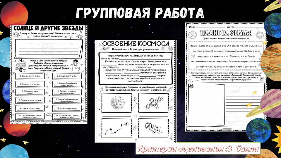 работа. Ребята мы заканчиваем раздел про космос и вместе в группах ответим на вопросы. В каждой группе свои вопросы и свои рабочие листы