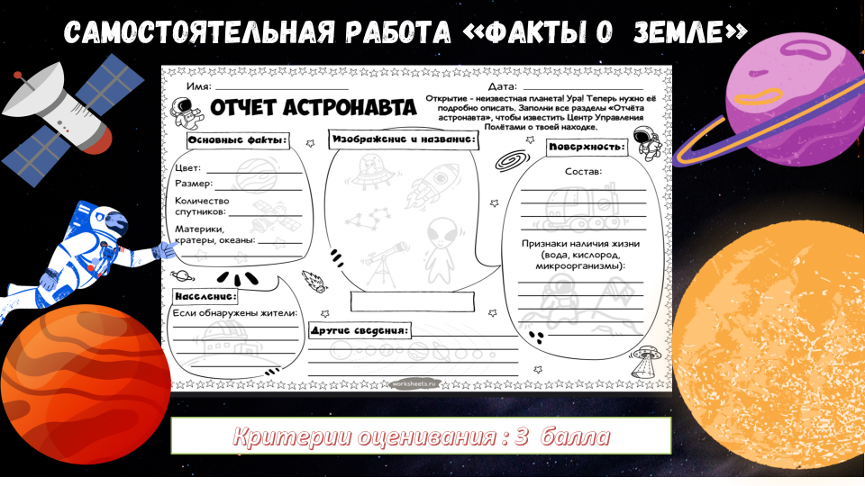 Предлагаю вам закрепить знания при помощи .Ваша задача написать все факты которые вы знаете про нашу планету «Земля» Самостоятельная работа.