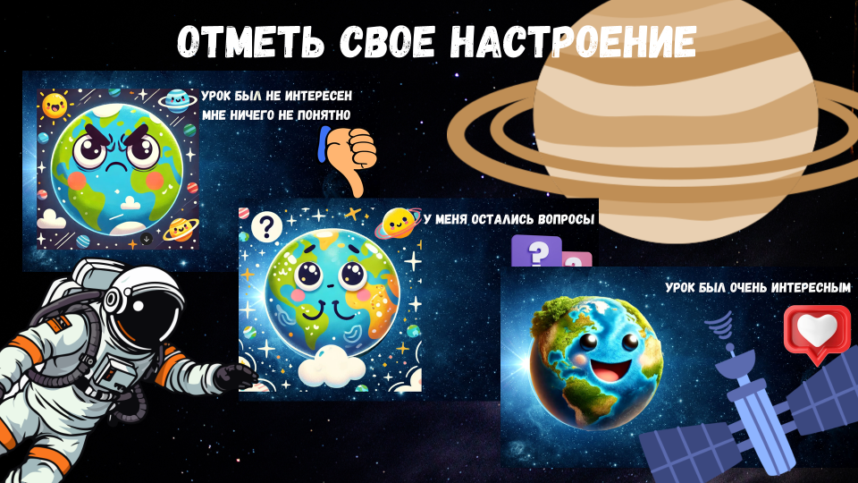 Итог урока. -Какую цель мы поставили на сегодняшнем уроке? - Достигли ли мы этой цели? - Какие затруднения были у вас на уроке? - Что нужно сделать чтобы эти затруднения не повторялись? Рефлексия. Предлагает оценить свою работу при помощи энергии космоса