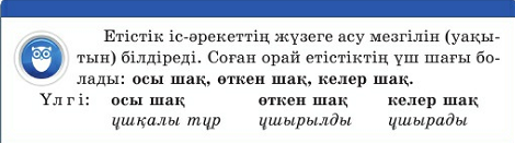 Мәтінді түсініп оқиды. Мәтіннің негізгі тұстарын белгілейді. Мәтіннен белгілеген тірек сөздері бойынша мәтіннің мазмұнын айтады. Мәтіндегі таралады, жетеді, тұрады, жатады етістіктерінің қай мезгілде болған әрекетті білдіріп тұрғанын айтып көреді. Сөйлемдерді қатесіз жазып, етістіктерді табады. Етістіктердің қандай мезгілдік ұғымда жұмсалғанын анықтайды. Жұмбақты оқып, шешуін табады. Етістікті тауып, қай шақта тұрғанын айтады. Сергіту сәтін іс-қимылмен көрсетеді.