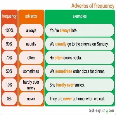 - learn and understand the position of adverbs of frequency in sentences - practise using adverbs of frequency - talk about habits using adverbs of frequency |