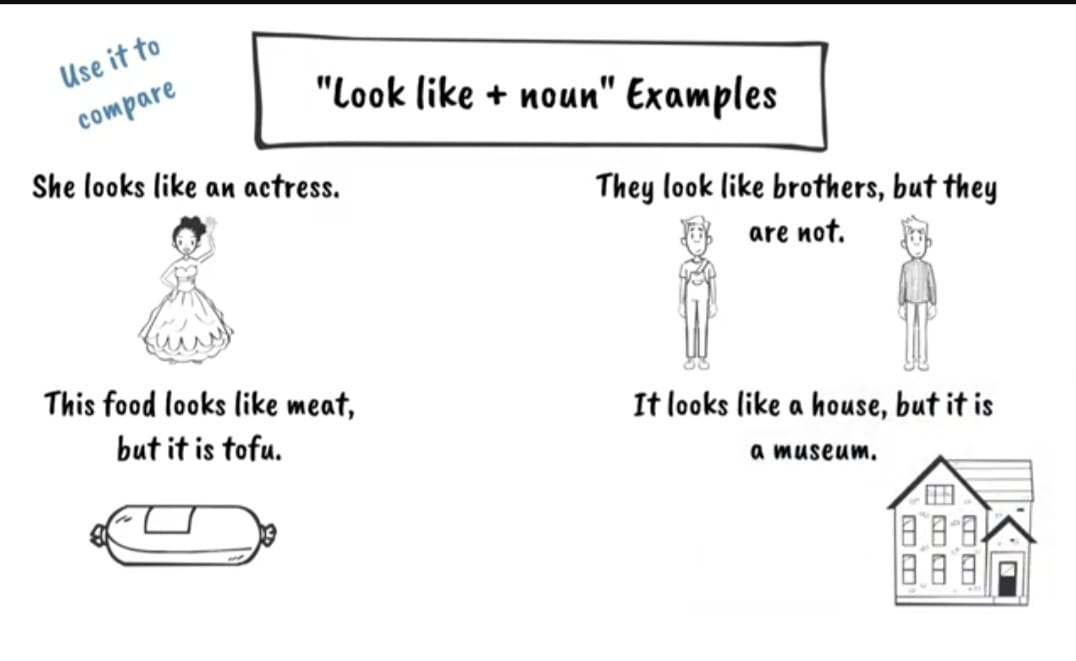Students look at the photo. What kind of art is the painting? ANSWERS: The painting is an example of abstract art. Students’ own answers. Students listen to the dialogue. Why does Lucy dislike the painting? ANSWERS: Lucy dislikes the picture because she thinks the face is a bit mad, as if a child painted it. Students study the key phrases then listen and check. ANSWERS: Lucy says all the phrases. Students look at the words in blue in the dialogue in exercise 1. ANSWERS: look = see here look like = resemble looks = appears to be looks as if = seems as though 1 Look 2 looks 3 looks like 4 looks like |