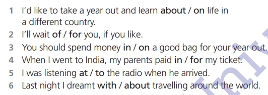Students listen to the teacher and write verbs with prepositions in their copybook. Students work individually and choose correct prepositions. Answers: 1.about 2.for 3.on 4.for 5.to 6.about |