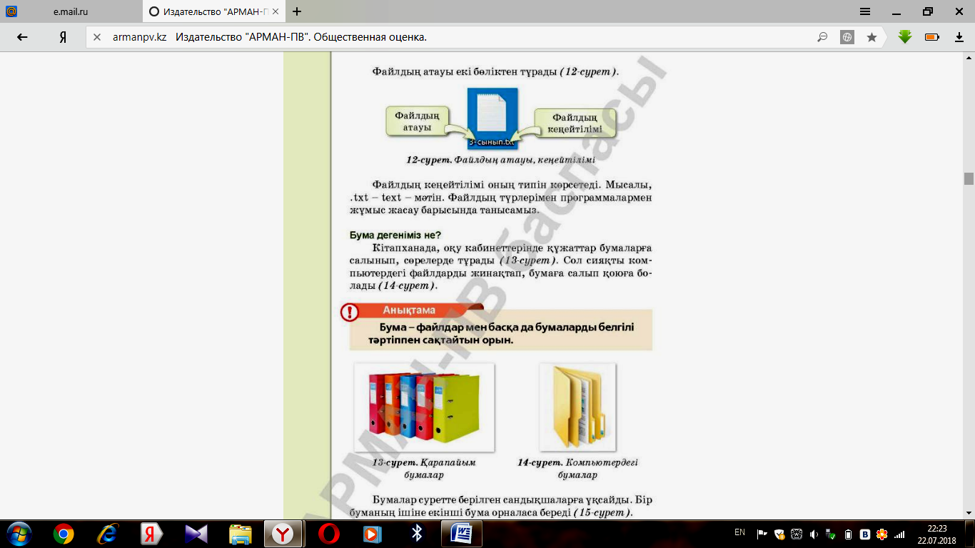 3.1.2.2. компьютерлік программаларда файлдарды ашу және сақтау командаларын пайдалану; 3.1.2.3. файл және бума ұғымдарын түсіндіру; |