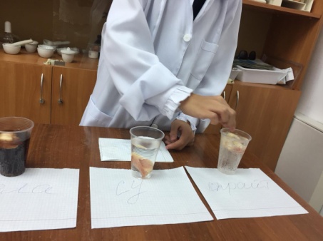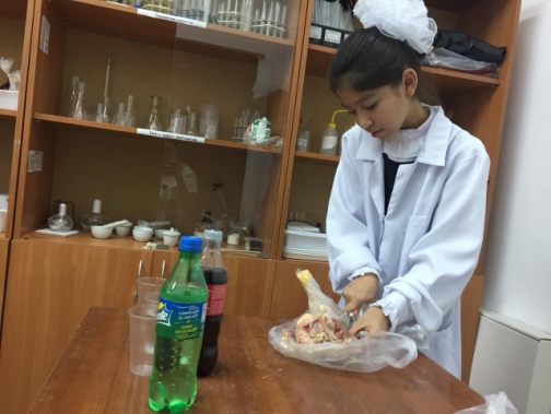Біз 3 түрлі су түрін алдық – кәдімгі жай су, фанта, кока – кола. Тәжірибе нысаны ретінде датталған шегені, тауық етін алдық.