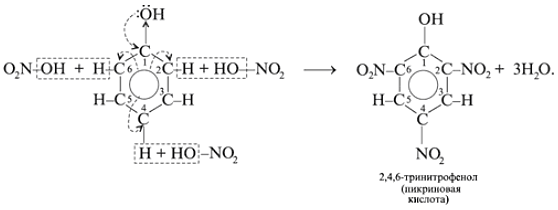 Это связано со смещением электронной плотности внутри бензольного кольца. В результате этого химическая связь между С – Н в положениях 2,4 и 6 ослабляется, т.е. атомы водорода в этих положениях становятся более подвижными для реакций замещения, пртекающих по бензольному кольцу.