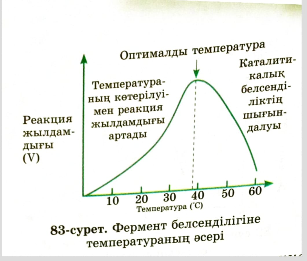 3. рН-тың фермент түрақтылы- ғына әсері. Ферментпен катализ дендірілген реакция жылдамдығы- ның температураға тәуелділігі. Адам денесінің температурасына (адам организмінің ферменті) максималды жылдамдығы сәйкес келеді.