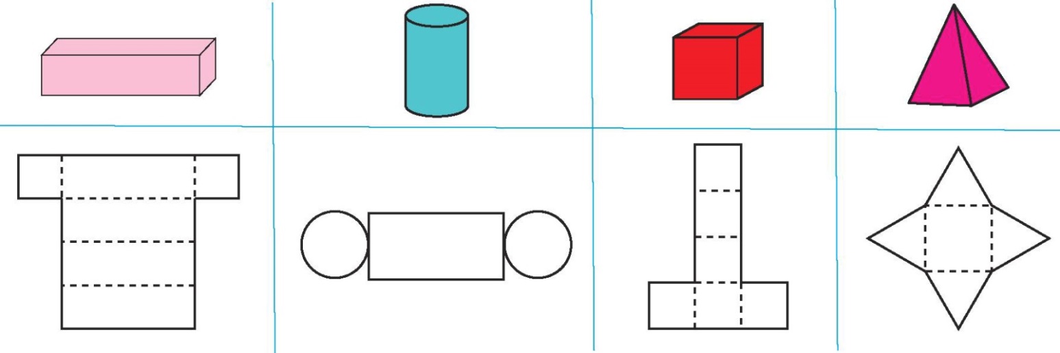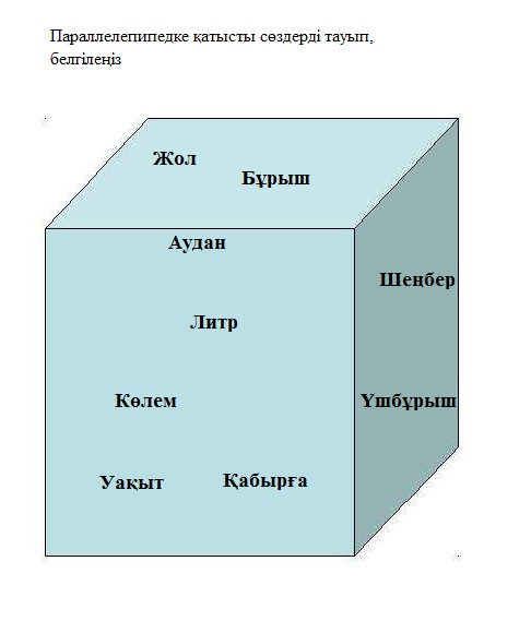 Доминоға ұқсас карточкаларға сұрақ пен жауапты бөліп жазады. Сұрақ пен жауапты қиып, қарсылас топқа таратады. Қарсылас топ сұрақ пен жауапты сәйкестендіру қажет. Берілген қағаздағы сөздерден параллелепипедке қатысты сөздерді табады. Есеп мазмұны бойынша жұбымен талқылау арқылы есеп моделін құрып, есепті шығарады, берілген хатқа жауабын жазады. Берілген дайын параллелепипед жазбасы бойынша өлшемдерін сызғышпен өлшейді. Сыныптан бір оқушы шығып жәшікте тұрған затты қалған оқушылардан жасырады. Оқушылар жасырған затты табуы қажет. Карточкадағы фигура жазбасына сәйкес фигураны сыныптастарының карточкаларынан іздеп табады. Топ ішінде міндеттерді бөліп алады. Тапсырма бойынша есеп моделін құрып, тапсырманы орындайды. Жазбаны қиып, макет жасайды. Макеттің жақтарын нөмірлейді. |