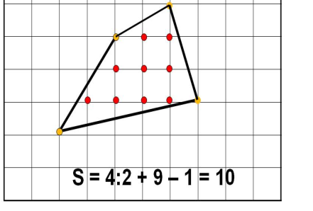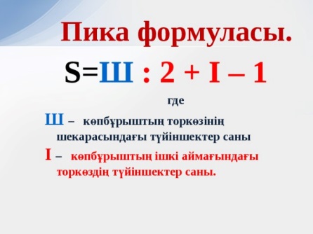 Барлық оқушылар: Пик формуласын біледі Оқушылардың басым бөлігі: фигуралардың ауданын табуға пик формуласын қолдана алады Кейбір оқушылар: курделі фигуралардың ауданын табады |