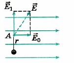 ЕСЕПТЕР ШЫҒАРУ № №2. Кернеулігі Е0=3 кН/Кл біртекті электр өрісінде q = 4•10-10 Кл заряд орналасқан. Нүктелік зарядтан 3 см қашықтықта орналасқан А нүктесіндегі электр өрісінің кернеулігін анықтаңдар. Зарядты және А нүктесін қосатын кесінді біртекті электр өрісінің күш сызықтарына перпендикуляр болып келеді.