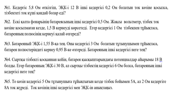 Сұрақтар: 1. Электр тогі дегеніміз не? 2. Ток күші шамасы нені білдіреді 3. Ток күшінің өлшем бірлігі не? 4. Кернеу дегеніміз не? 5. Кернеудің өлшем бірлігі не? 6. Электр кедергі дегеніміз не? 7. Электр кедергісі неге тәуелді? 8. Тізбек бөлігі үшін Ом заңын тұжырымдаңыз |