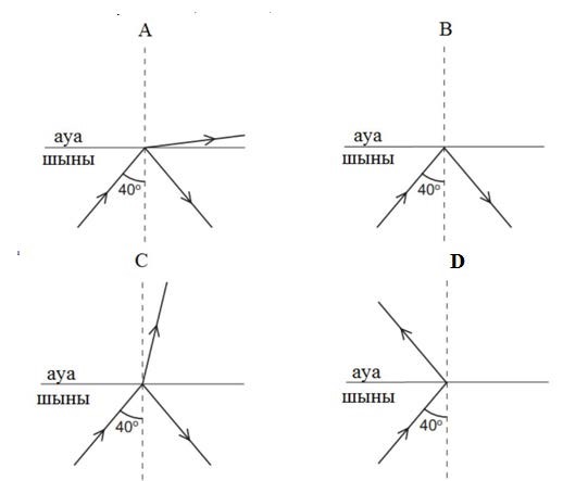 3.Жарықсәулесішыныданауаға40отүсубұрышыменөтіпжатыр.Шыны-ауашекарасыүшіншектібұрыш 32°. Қайсуреттежарықсәулесініңжүрісідұрыскөрсетілген?