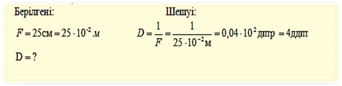 D = 1/F Жұқа линза формуласы:
