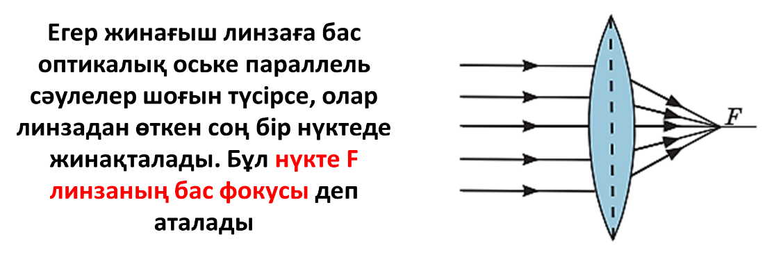 Оптикалық аспаптардың негізгі бөлігі – линза. Линзалар – екі сфералық бетпен шектелген мөлдір шыны денелер. Линзалардың 2 түрі бар: жинағыш (өзінен өткен жарықты фокусы деп аталатын нүктеде жинақтайды) және шашыратқыш (өзінен өткен жарықты жан-жаққа шашыратады).