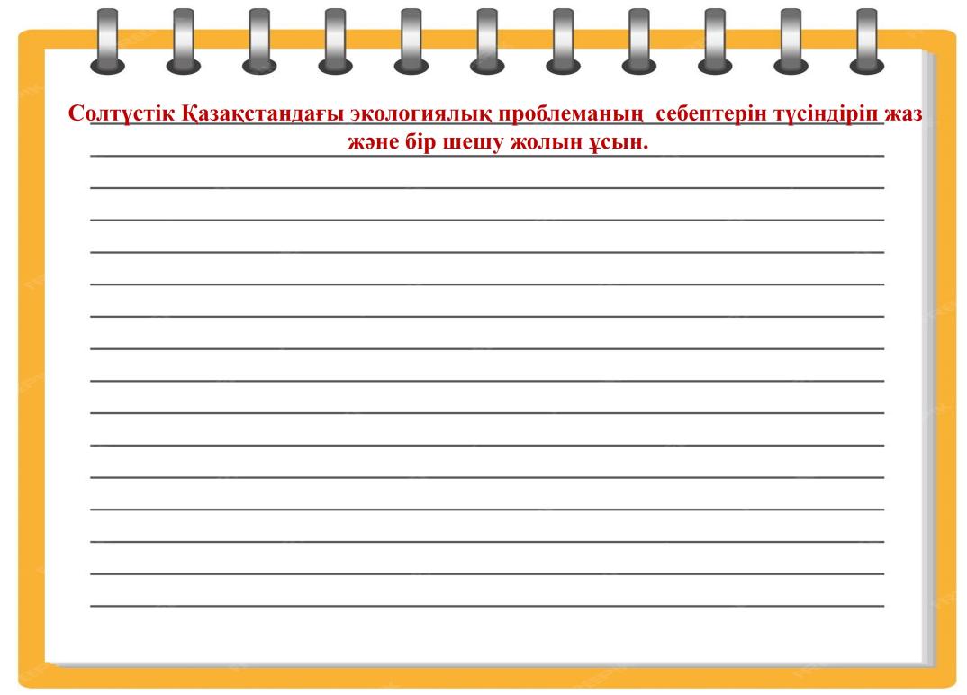 1. Солтүстік Қазақстан экологиялық проблемасының себептерін түсіндіріп беріңдер және бір шешу жолын ұсыныңдар.
