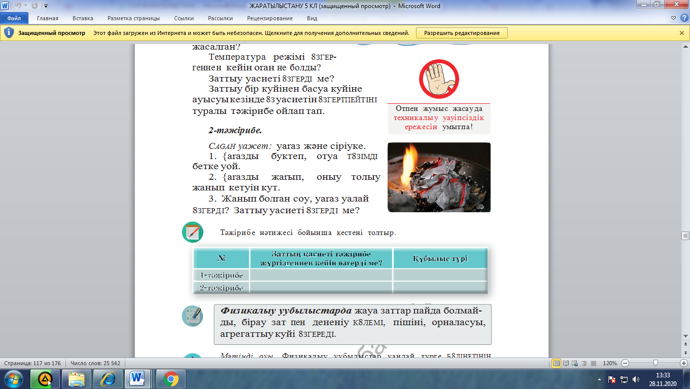 2-Тәжірибе. Бізге қажет: қағаз және сіріңке. 1. Қағазды бүктеп, отқа төзімді бетке қойады. 2. Қағазды жағып, оның толық жанып кетуін күтеді. 3. Жанып болған соң, қағаз қалай өзгерді? Заттың қасиеті өзгерді ме?