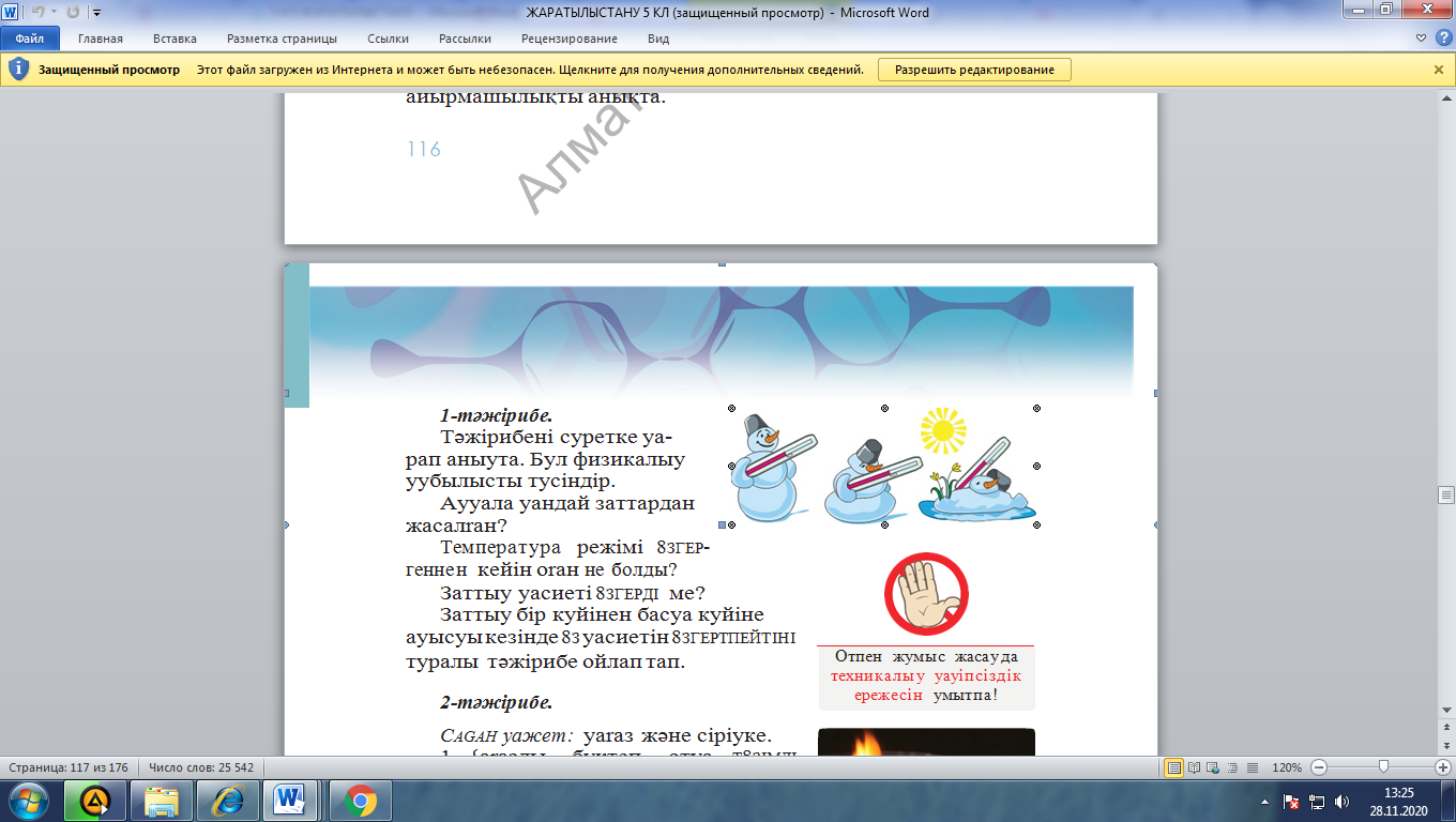 1-Тәжірибе. Тәжірибені суретке қарап анықтайды. Бұл физикалық құбылысты түсіндіреді. Аққала қандай заттардан жасалған? Температура режімі өзгергеннен кейін оған не болды? Заттың қасиеті өзгерді ме? Заттың бір күйінен басқа күйін ауысуы кезінде өз қасиетін өзгертпейтіні туралы тәжірибе ойлап табады.