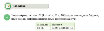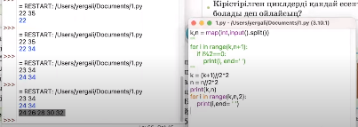 1-тапсырма Программа кодын жазады. k,n=map(int,input().split()) "" for i in range (k,n+1): if i%2==0: print(i,end = ' ') "" k=(k+1)//2*2 n=n//2*2 print(k,n) for i in range (k, n, 2): print(i, end = ' ') F5 Мысалды енгізеді. 23 35 Нәтижені шығарады. 24 26 28 30 32 34 24 34