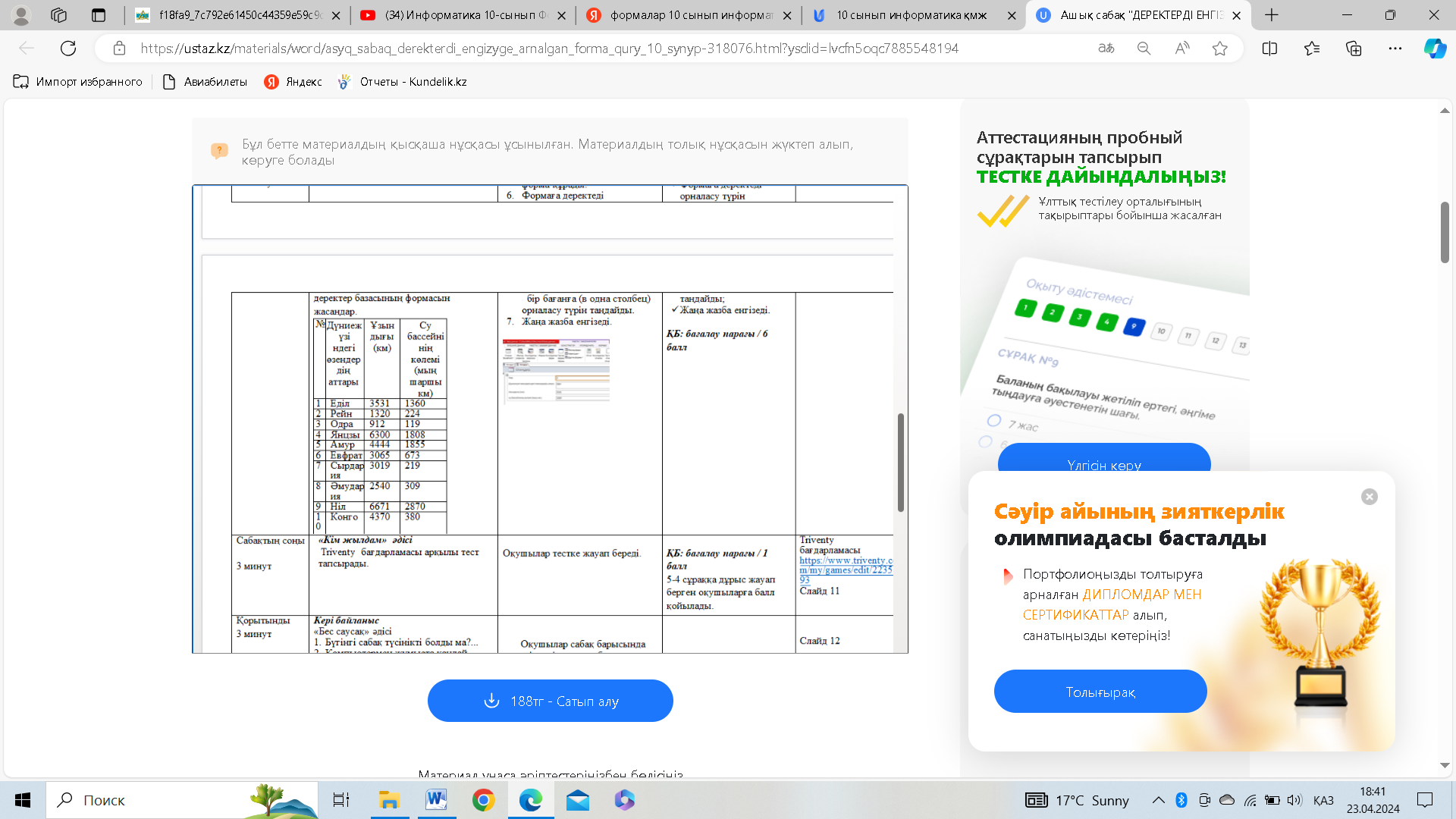 Тақырып пен сабақ мақсатымен таныстыру. Жаңа сабақты түсіндіру үшін бейнероликті тамашалау. (34) Информатика 10-сынып Формалар 10.3.2.4 деректерді енгізуге арналған форма жасау - YouTube Тапсырмалар орындау. 1-тапсырма. Жеке жұмыс: Дүниежүзі өзендерінің арасынан 10 өзен ұзындығы және су бассейнінің көлемі бойынша кесте берілген. Осы кестедегі мәліметтерден деректер базасын құрыңдар. Форма шеберінің көмегімен деректер базасының формасын жасаңдар.
