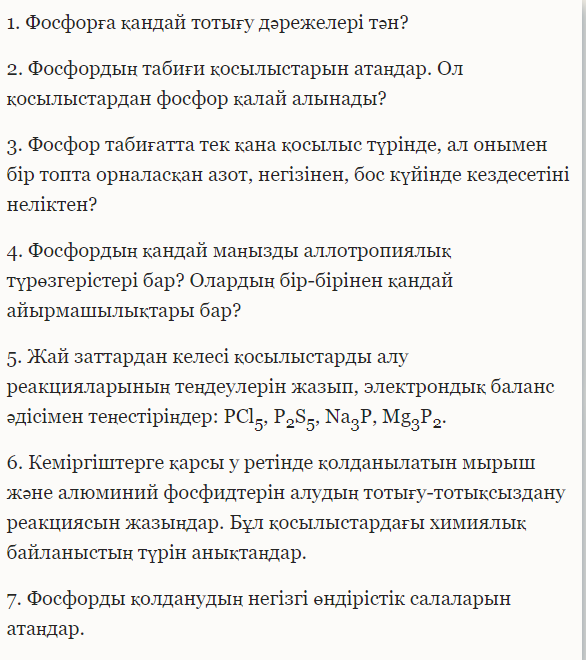 Фосфордың аллотропиялық түрөзгерістерін салыстырады; Фосфор қосылыстарының Қазақстандағы кен орындарын анықтайды; Фосфор және оның қосылыстарының жалпы химиялық қасиеттерін сипаттайды. |
