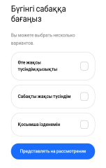 «Таңдау» әдісі. Мұғалім сабақты қорытындылау мақсатында оқушылардың сабаққа деген көзқарасын рефлексиясын оқушылардың таңдаған жауабы арқылы біледі Мақсаты:Оқушы алған білімін саралай білуге дағдыланады. Тиімділігі:Тақырып бойынша оқушылардың пікірін анықтайды. Жинақталған деректердің құнды болуын қадағалайды. Саралау: Бұл кезеңде саралаудың «Қорытынды» тәсілі көрінеді. |