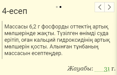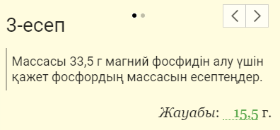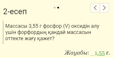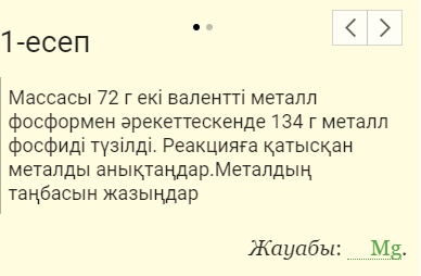 Дескриптор:Әр есепке 3 балл: Есептің берілгенін жазу-1 Химиялық реакция теңдеуді дұрыс жазу-1 Сандық есептеуді дұрыс жүргізу-1 |