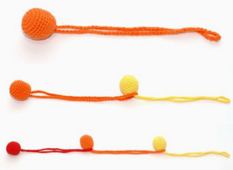Шар дөңгелек, өткір бұрыштарсыз. Жазықтықтар немесе сызықтар жоқ. Оны ұстап тұру оңай. Доп салмағы мен өлшемі бар. Жұмсақ иірімжіп икемді және сәл сығылуы мүмкін. Ол жұмсақ және, мүмкін, әлсіз иісі бар. Қысылған және шашылған жүн доп бала "мұнда" немесе "мұнда емес" ұғымдарын біледі.