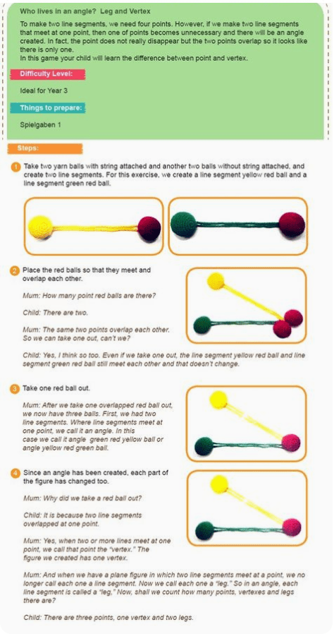 Сіз бұрыш пен шыңдар мен т. б. идеяларын әлеммен байланыстыра аласыз. Бөлмедегі бұрыштардың бар - жоғын сұраңыз. Бұл жаттығу тұжырымдаманы нығайтады және балаға күнделікті әлемде көлденең, тік және параллель сызықтарды көруге көмектеседі. Бұл іздестірулерді ойынға немесе тарихқа айналдырыңыз.