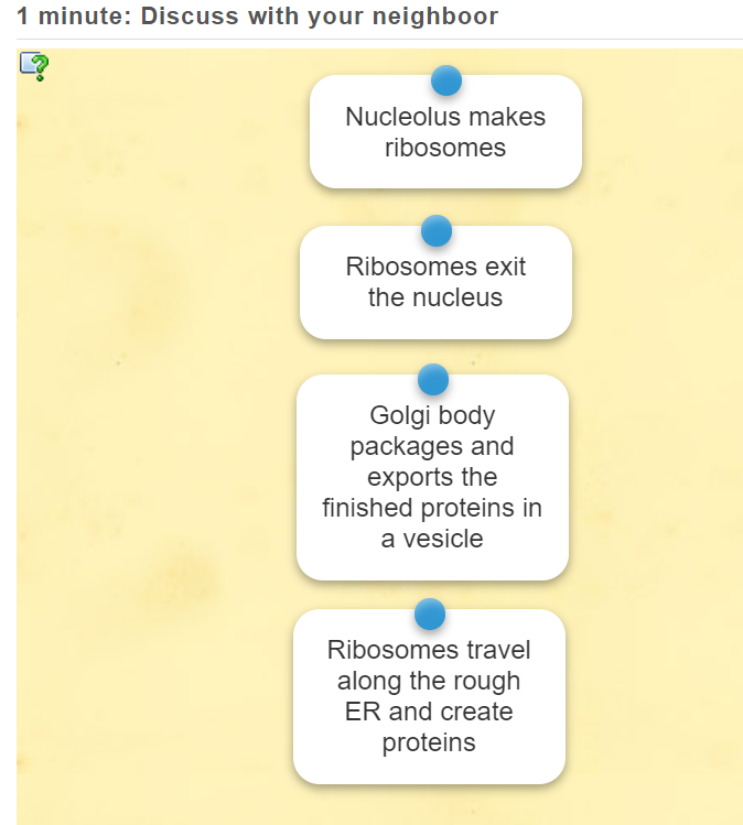 Organizational stage: 1.Which organelle builds proteins? ribosome 2.Stores DNA? Nucleus 3. Produces ribosomes? Nucleolus 4. Creates fats and breaks down toxins? Smooth ER 5. Packages and releases proteins from a cell? Golgi body 6. Allows material to enter or exit a cell? Plasmatic membrane 7. Links chains of amino acids together? ribosome |