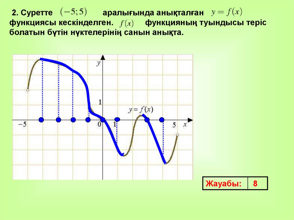 1.Функция [-7; 2) және (2; 8] аралығында өссе, ол [-7; 8] осы аралықта өспелі болатыны распа? 2.Функцияның х0 нүктесіндегі туындысы 0-ге тең, бұл х0 сындық нүкте екенін білдіреді. Бұл рас па?