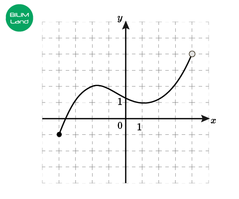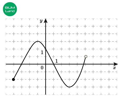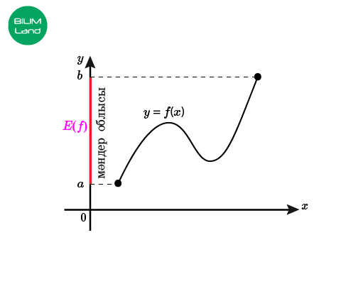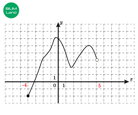 ⠀Шешуі. ⠀x тәуелсіз айнымалысының барлық мәні [– 4; 5) сан аралығына тиісті. Функция графигінің оң жақтан координаттары (5; 3) боялмаған нүктесімен шектелгеніне назар аудар. Боялмаған нүктенің 5 -ке тең абсциссасы функцияның анықталу облысына енбейді. Демек, y = f (x ) функциясының анықталу облысы – [– 4; 5) жартылай интервалы. ⠀Жауабы: D ( f ) = [– 4; 5). ⠀Функцияны көбінесе аналитикалық түрде береді. Егер бұл жағдайда функцияның анықталу облысы көрсетілмеген болса, онда функциясының анықталу облысы тәуелсіз айнымалының барлық мүмкін мәні деп саналады, яғни функцияның бар болатын және мағынасы болатын мәндері. ⠀⠀Тәуелді айнымалының қабылдайтын барлық мәнінің жиынын функцияның мәндерінің облысы немесе жиыны деп атайды және E (f) немесе E (y) деп белгілейді.