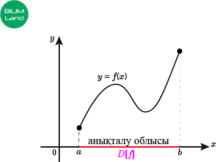⠀Егер оның анықталу облысы және айнымалылар арасындағы тәуелділікті орнататын заңдылық берілген болса, функция берілген деп саналады. ⠀1-мысал. ⠀Суретте y = f (x ) функциясының графигі бейнеленген. Графикті пайдаланып, берілген функцияның анықталу облысын тап.