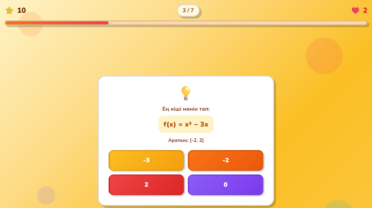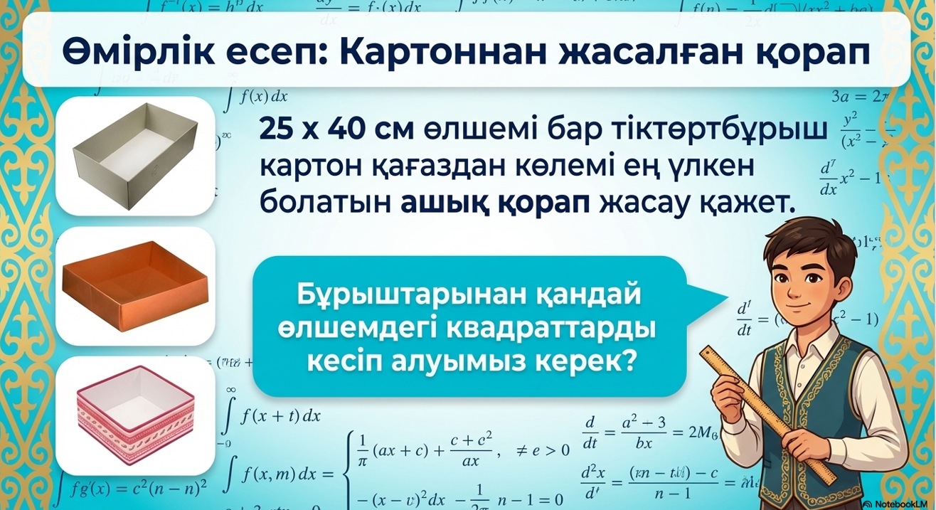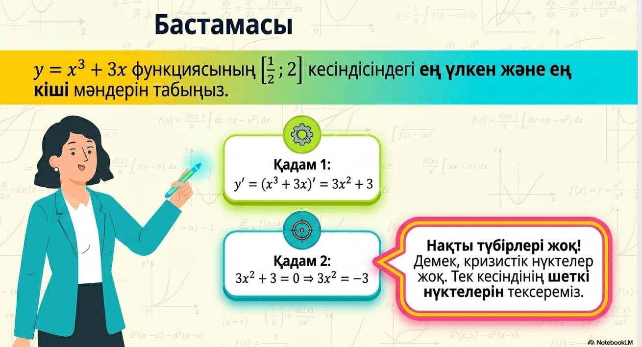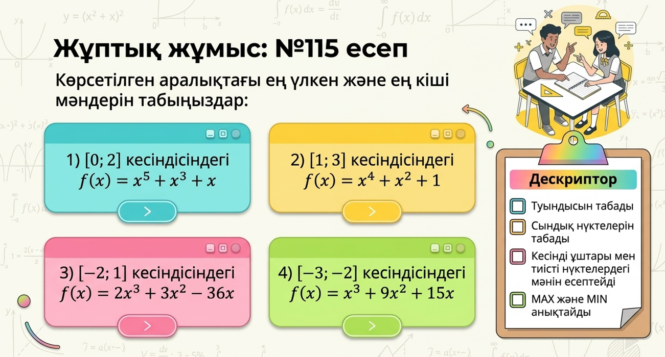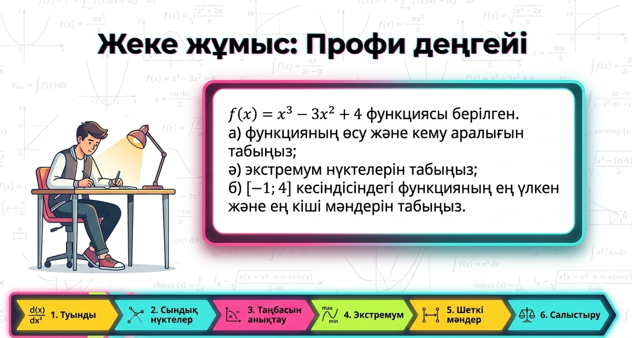 Дескриптор: Білім алушы функцияның туындысын есептейді; туындыны нөлге теңестіріп, сындық нүктелерін анықтайды; сындық нүктелер мен аралықтарда функцияның өсу/кемуін зерттейді; функцияның ең үлкен және ең кіші мәндерін анықтайды; 2 балл |