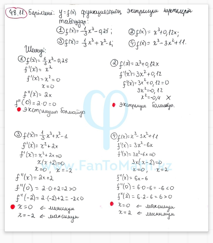 Есептер шығару №48.9 функцияның эктремум нүктелері болмайтыны дәлелде 1)f(x)=9-13x 2)f(x)=-17+x3