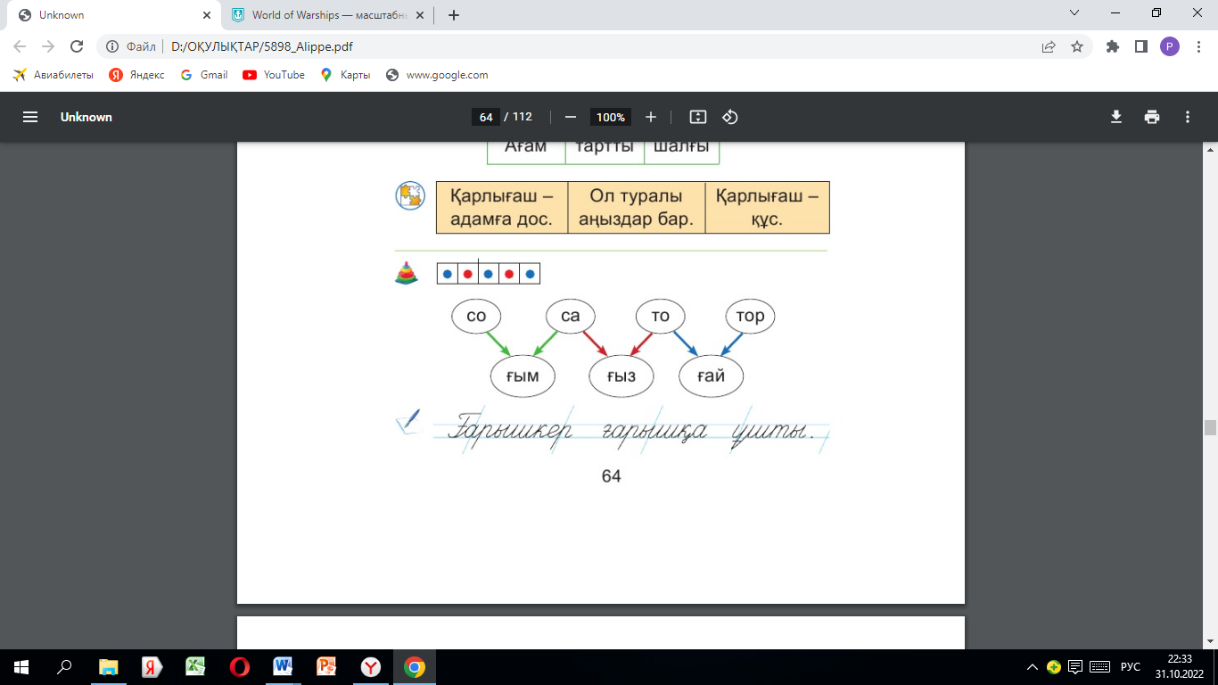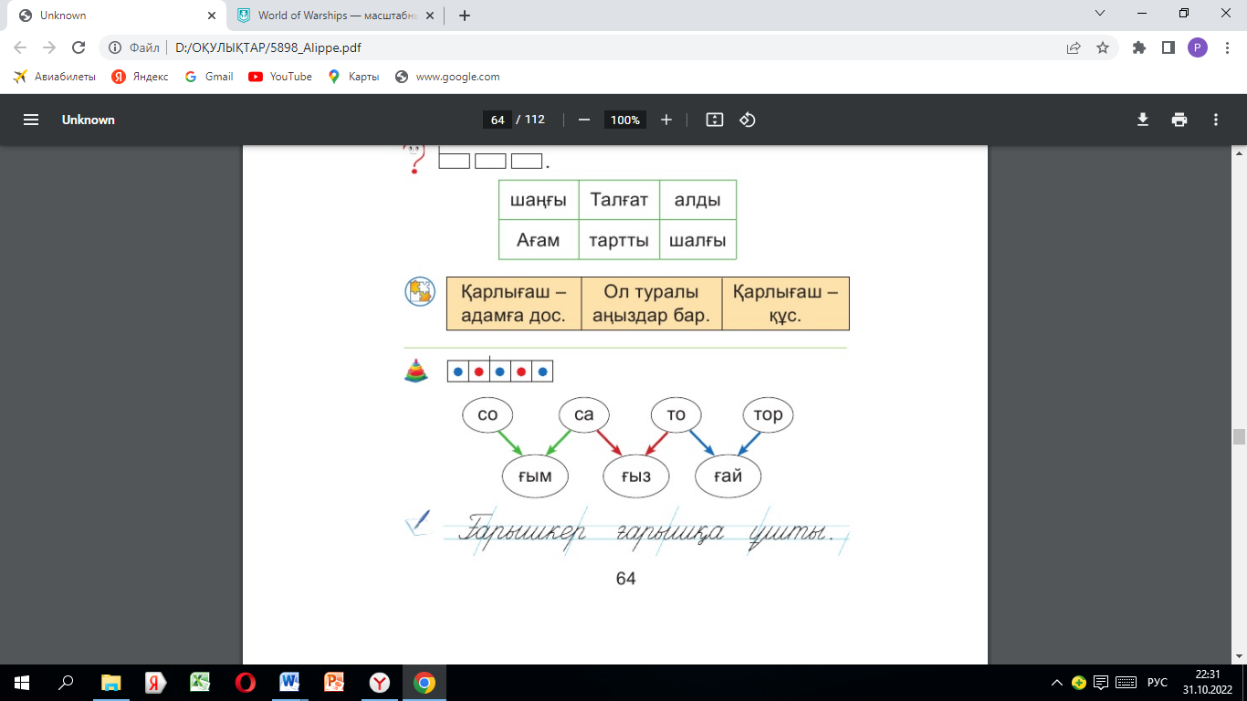 1. сызба бойынша сөйлем құрастырады 2.сөйлемді жазады 1. сөйлемдердің ретін анықтайды 2.мәтін құрастырады 1. буындардан сөз құрастырады 2.құраған сөздерін жазады |