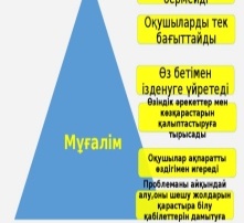 Мұғалім оқуышларға бағыт- бағдар беріп, ынтымақтастықта жұмыс жасауға, ойын анық, дәл, нақты жеткізе білуге баулиды. Тапсырма Жеке жұмыс Мұғалім оқушылардың қате кеткен тұстарына көмек беріп, түзейді. Қосымша ақпарат көздерінен тың мәлімет береді. |