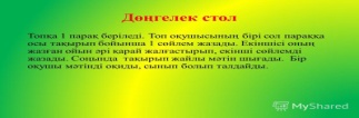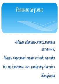 Тыңдалым Оқылым Топқа бөлініп, тапсырмаларды орындайды. 1-топ: Мәтіндегі басты кейіпкерге мінездеме береді, постер қорғайды. 2-топ: Мақал-мәтелдердің мазмұнын талдайды.