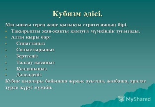 Оқылым Жазылым Тапсырманы орындап, «Кубизм» әдісі арқылы сипаттайды.