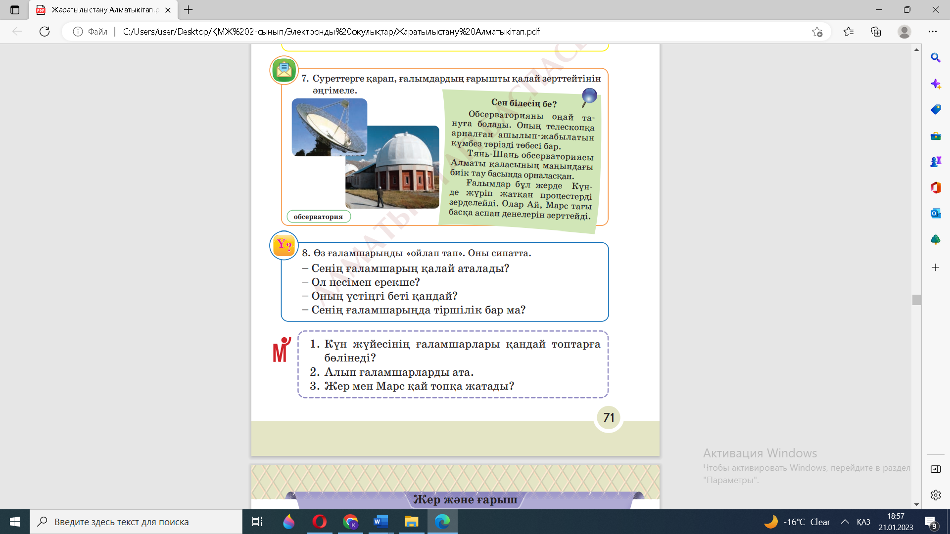 ЕББҚЕО: мәтінді тыңдайды. Сұрақтарға мұғалімнің сүйемелдеуімен жауап береді. «Кинометафора» әдісі https://www.youtube.com/watch?v=wPkREi5WnEs https://www.youtube.com/watch?v=u5hm3ZkVFeU Юпитер, Марс туралы мәлімет алады.